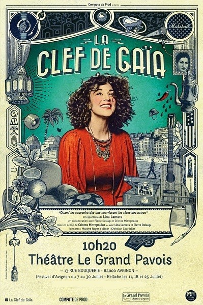 La clef de Gaia est un conte musical, poétique et philosophique relatant l’histoire de Lina à travers les douces anecdotes de sa grand-mère Mouima. Accompagnée de la musique de son guitariste Pierre Delaup, l’interprète nous livre avec beaucoup de tendresse des instants de vie de jeune fille à jeune femme à la rencontre de l’Algérie et de la France : elle nous parle du hammam traditionnel, de la cuisine de sa Mouima, de ses rêves de chanteuse de blues, de ses amours.